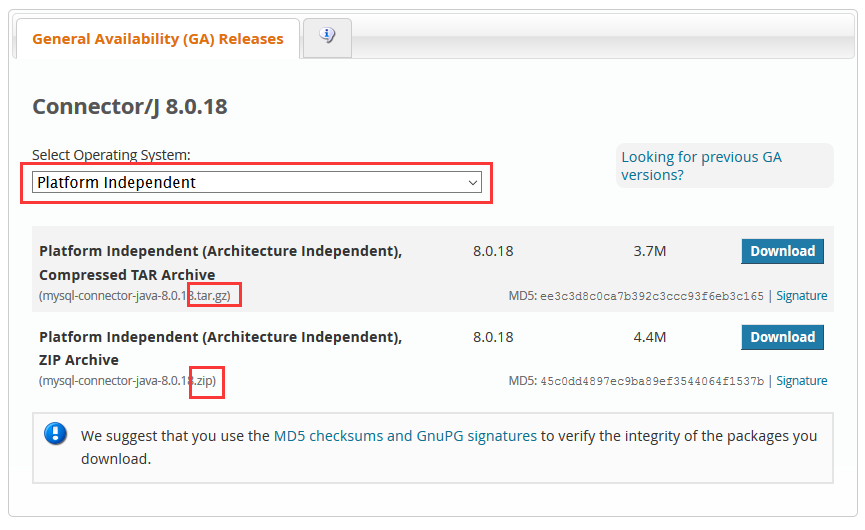 操作系统选择Platform Independent,下方列表中的两条记录,后缀tar.gz的是Linux版本,.zip的是windows版本。