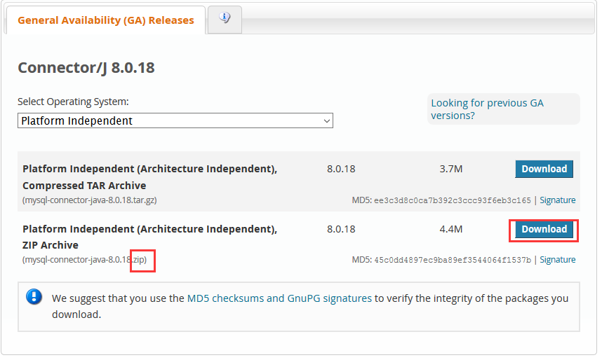 这里下载windows版本的jdbc驱动,版本为8.0.18